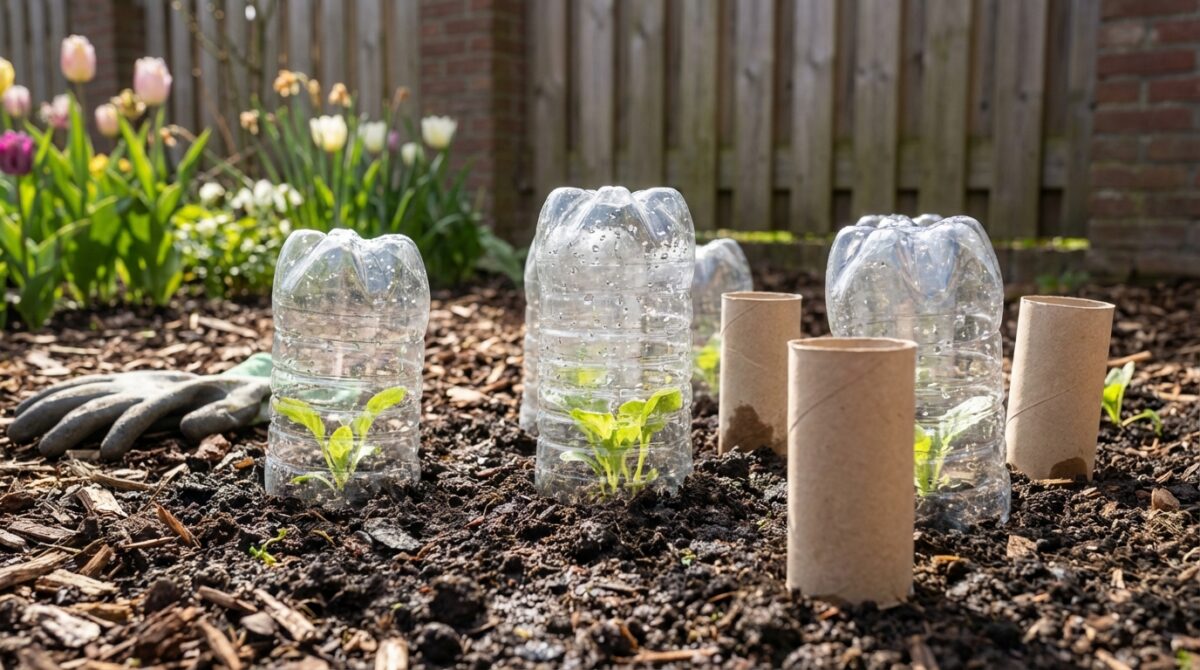 Kartonnen wc-rollen isoleren verrassend goed tegen kou. Zet een rol rechtop rondom een zaailing als een beschermende koker. Dit helpt de bodemtemperatuur stabiel te houden en voorkomt nachtvorstschade.